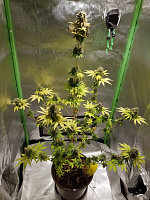 Куст рос 16 недель, урожай не большой, структура сильно разряжена. Эффект сативный high. Ест удобрений мало, как и слабо набирает массу.